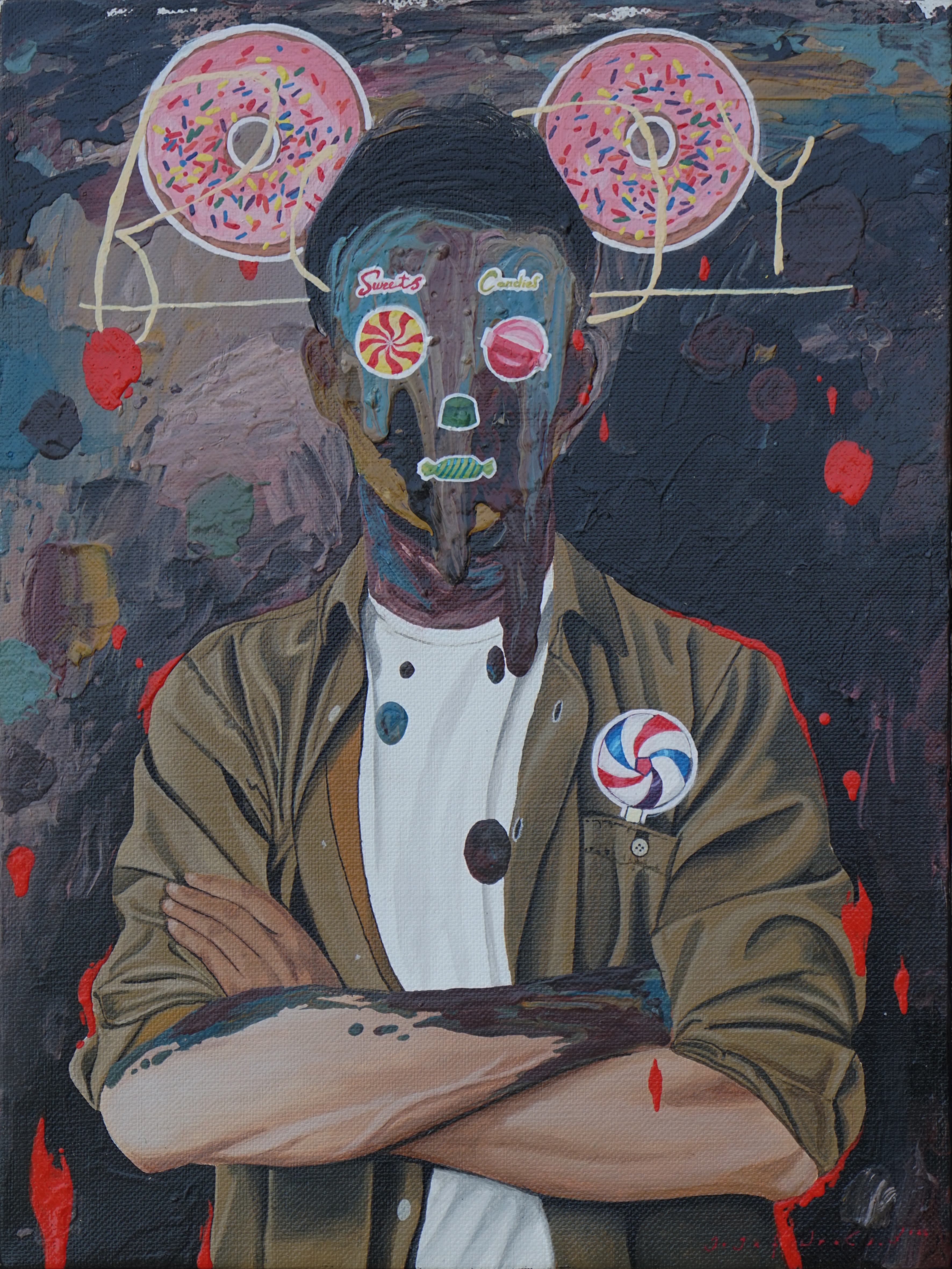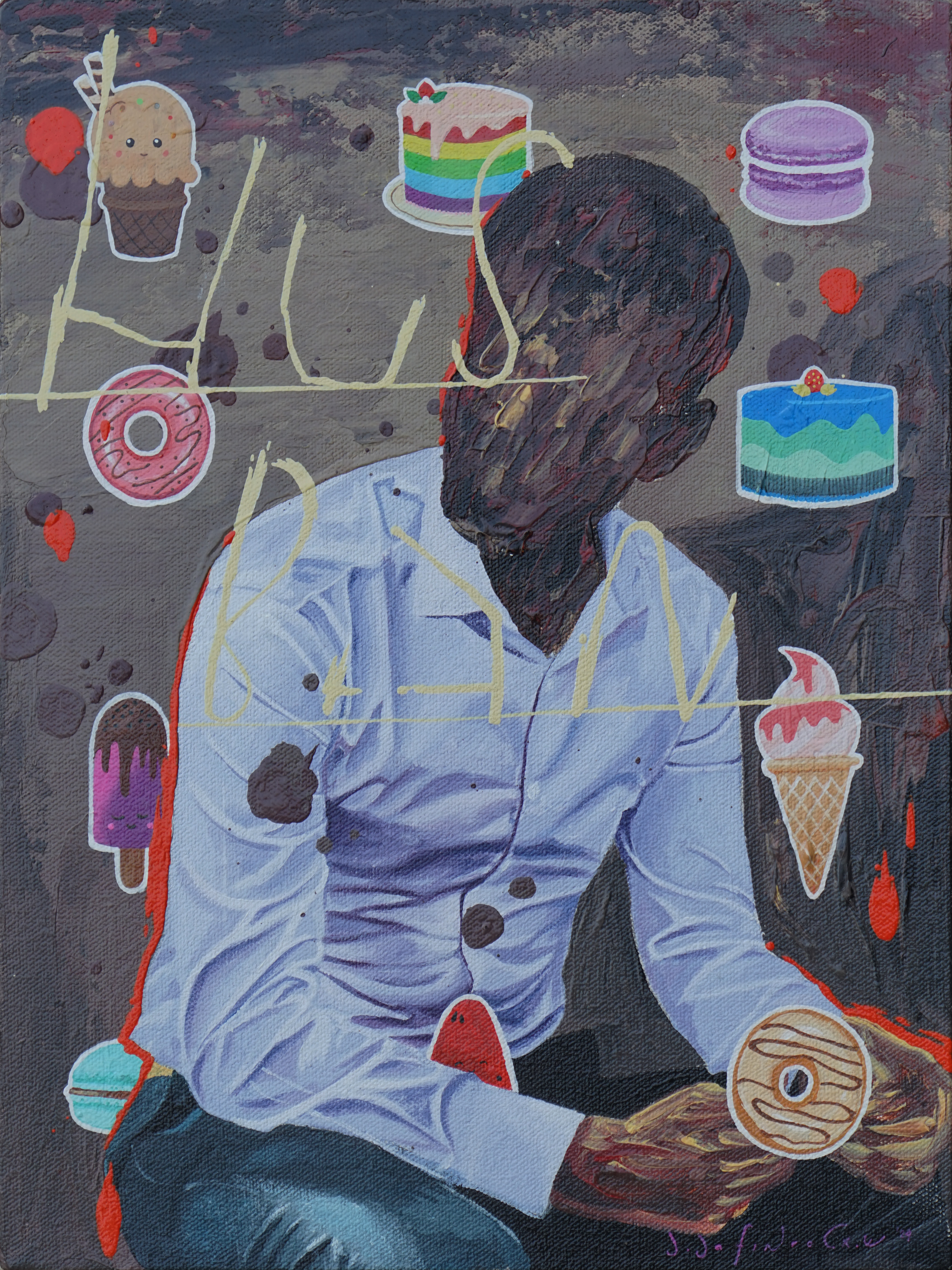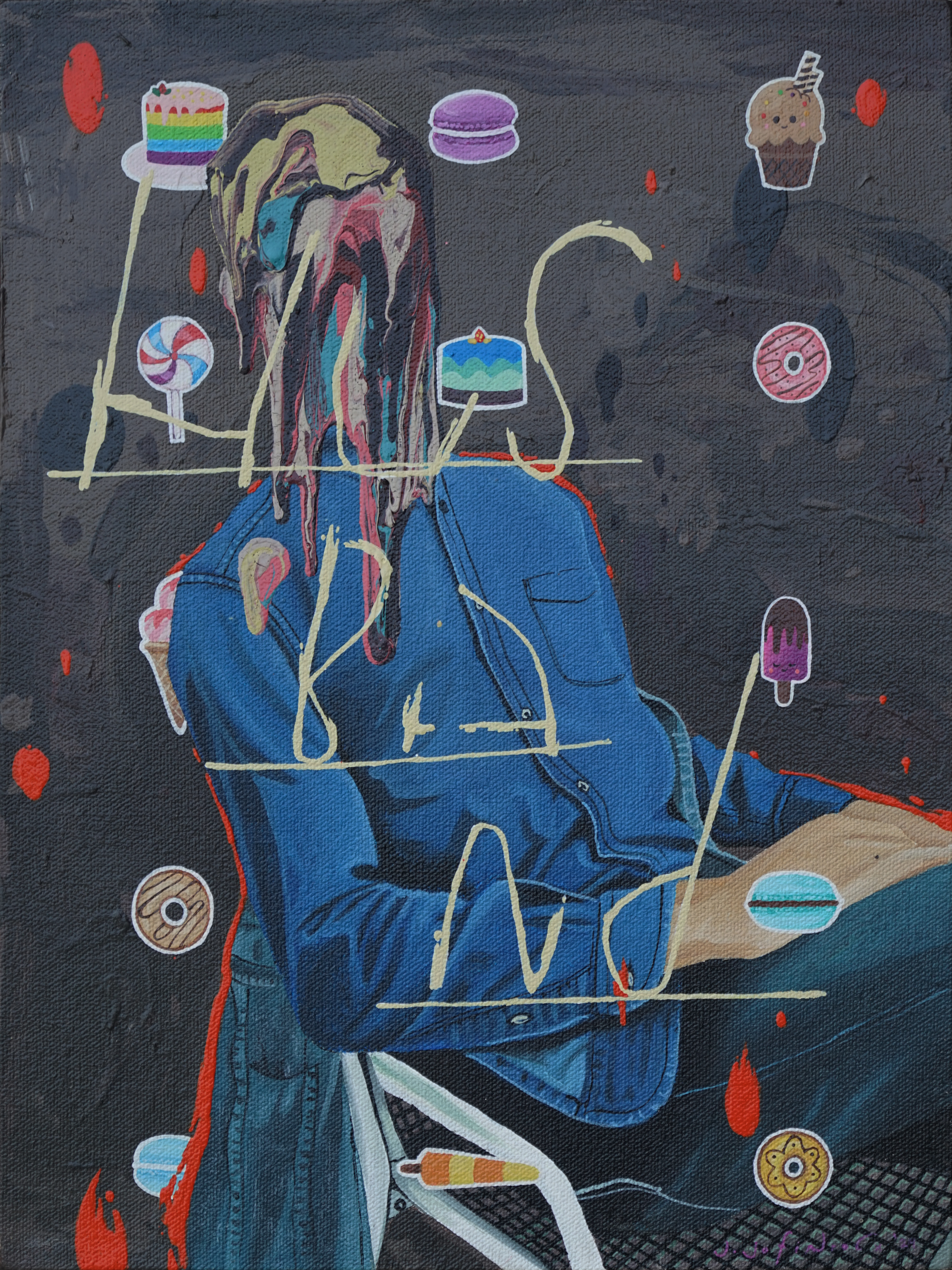 Jafin’s anxiety can be seen through his choice of colors, shapes, composition, appropriation, which offers irony, paradox, and sometimes bitterness. These kinds of works became a kind of sign of the times, created by a number of young artists in different variants, (Reminding me to the works of Zico Al Baiquni, Prabu Perdana, Lugas Sylabus, or Aurora Santika, among other names). Although the paintings are colorful, bright, soft, and sometimes sharp, they are not always joyful, but instead have a somber message.