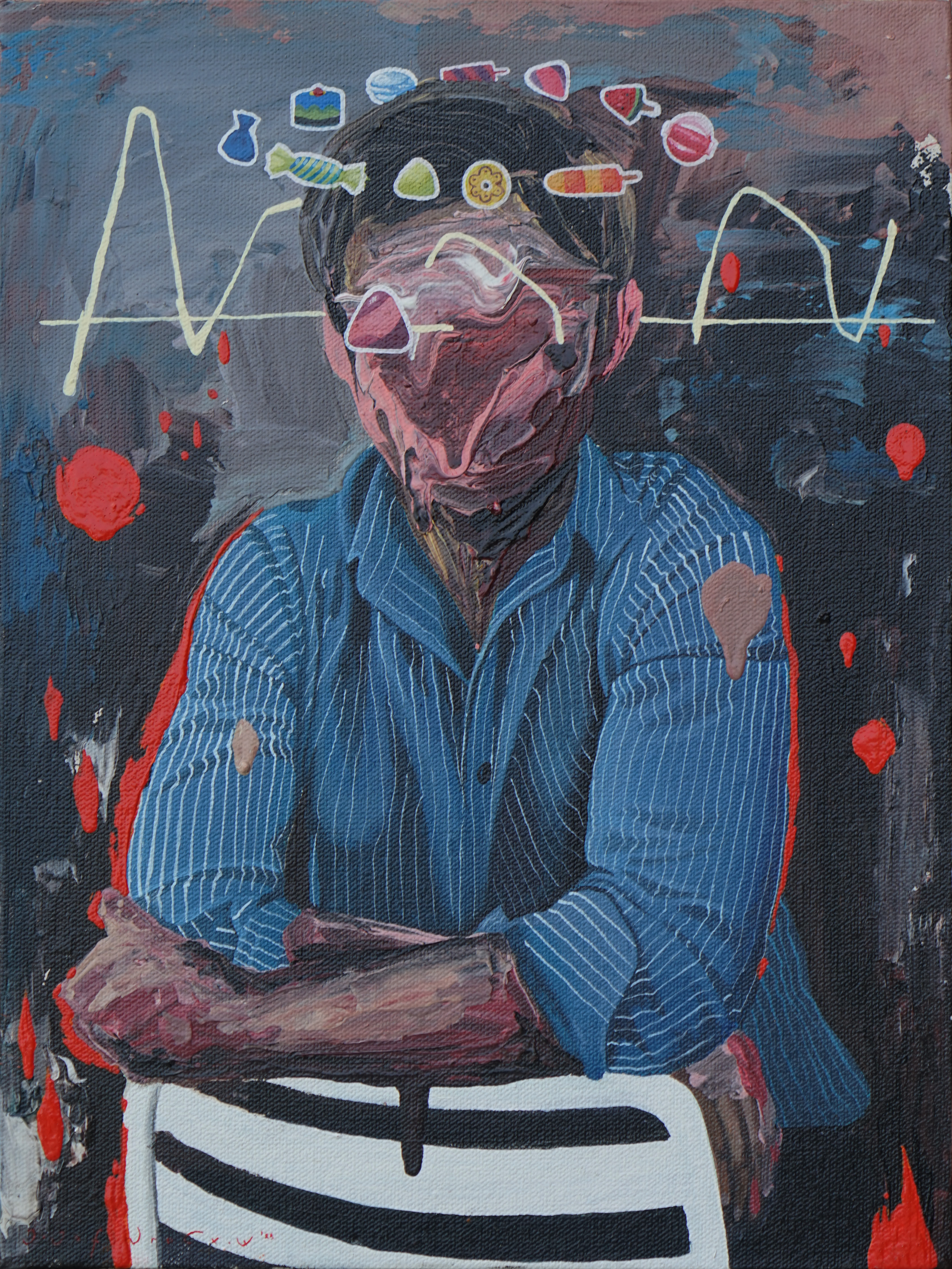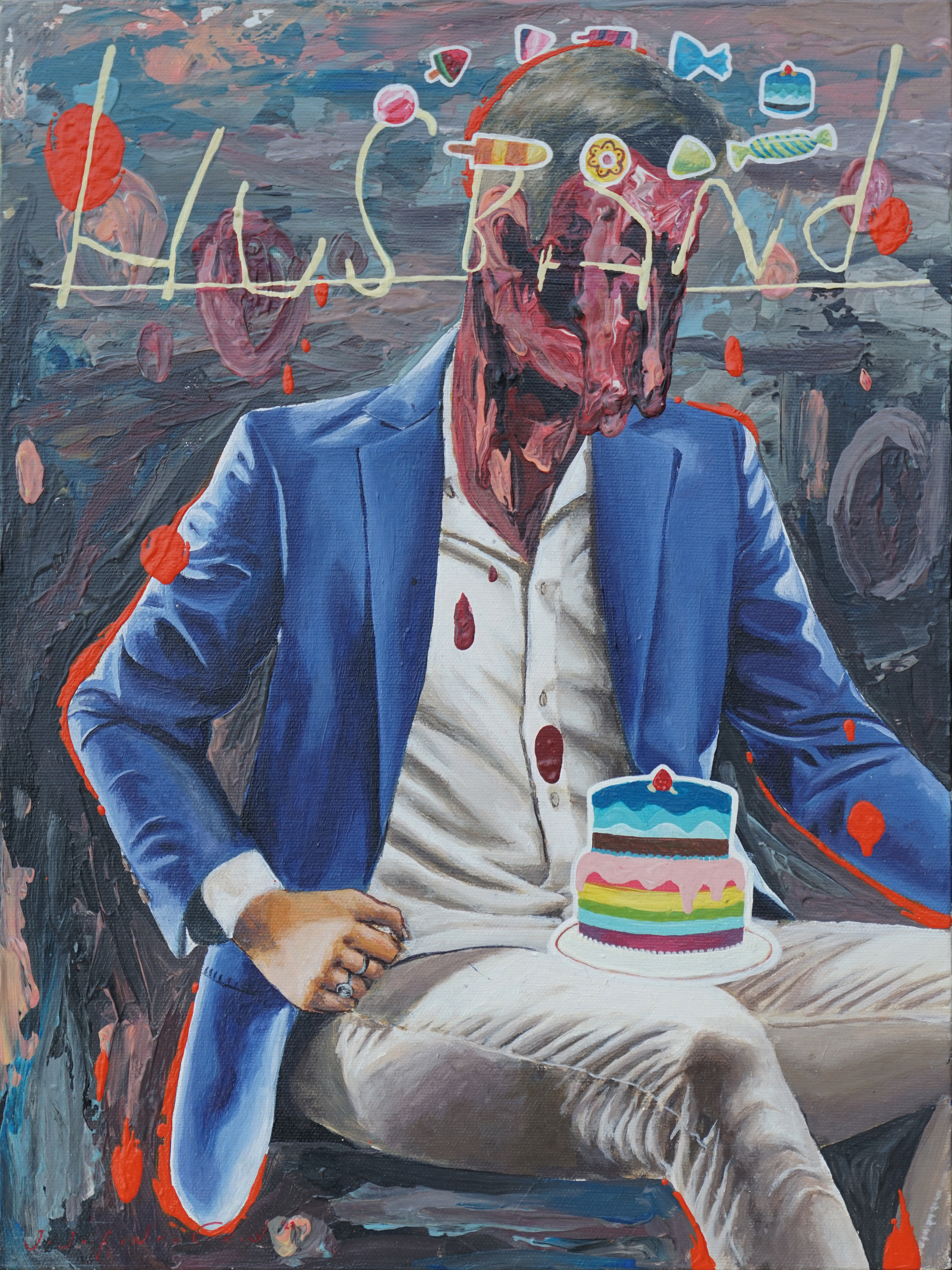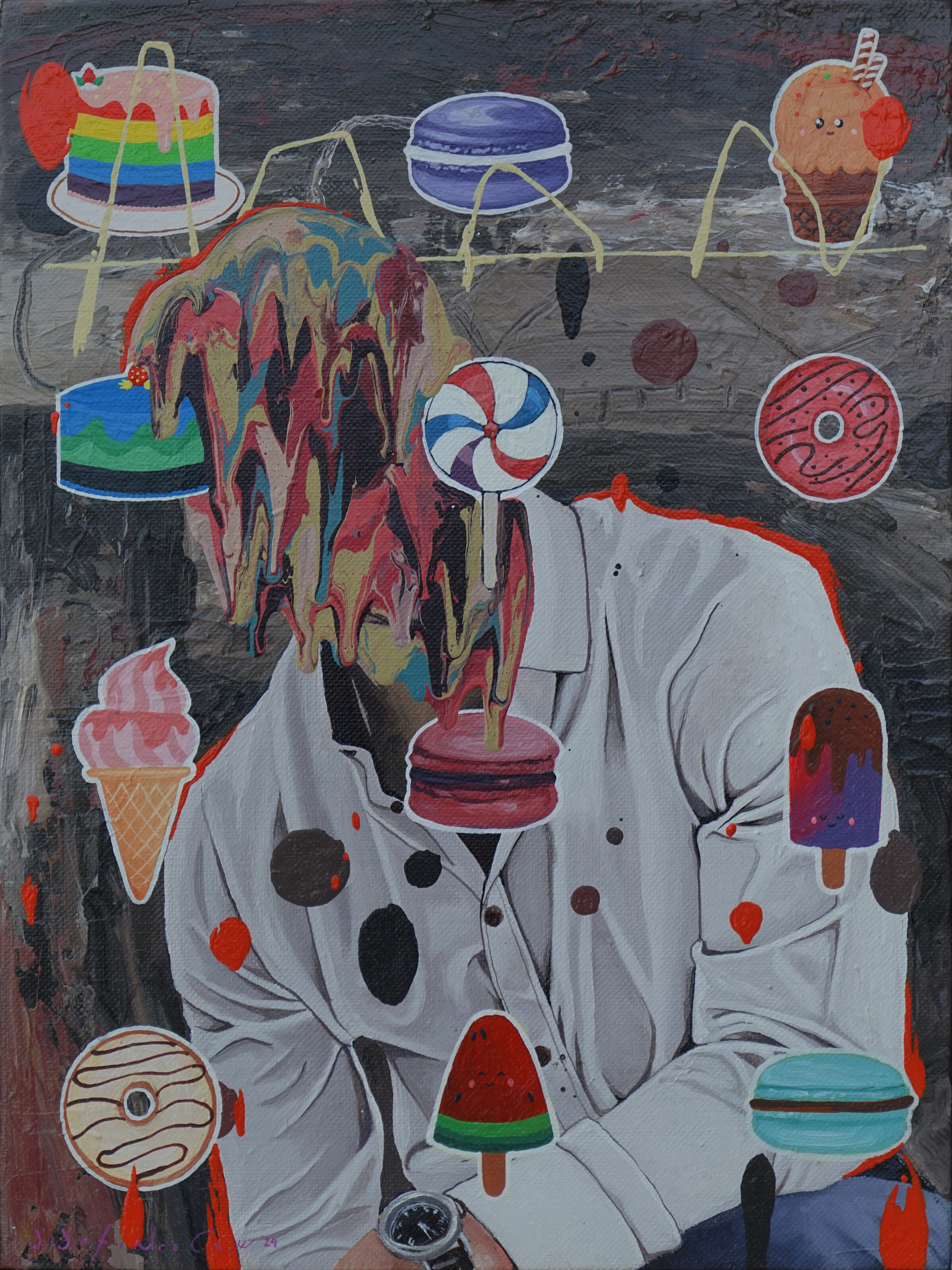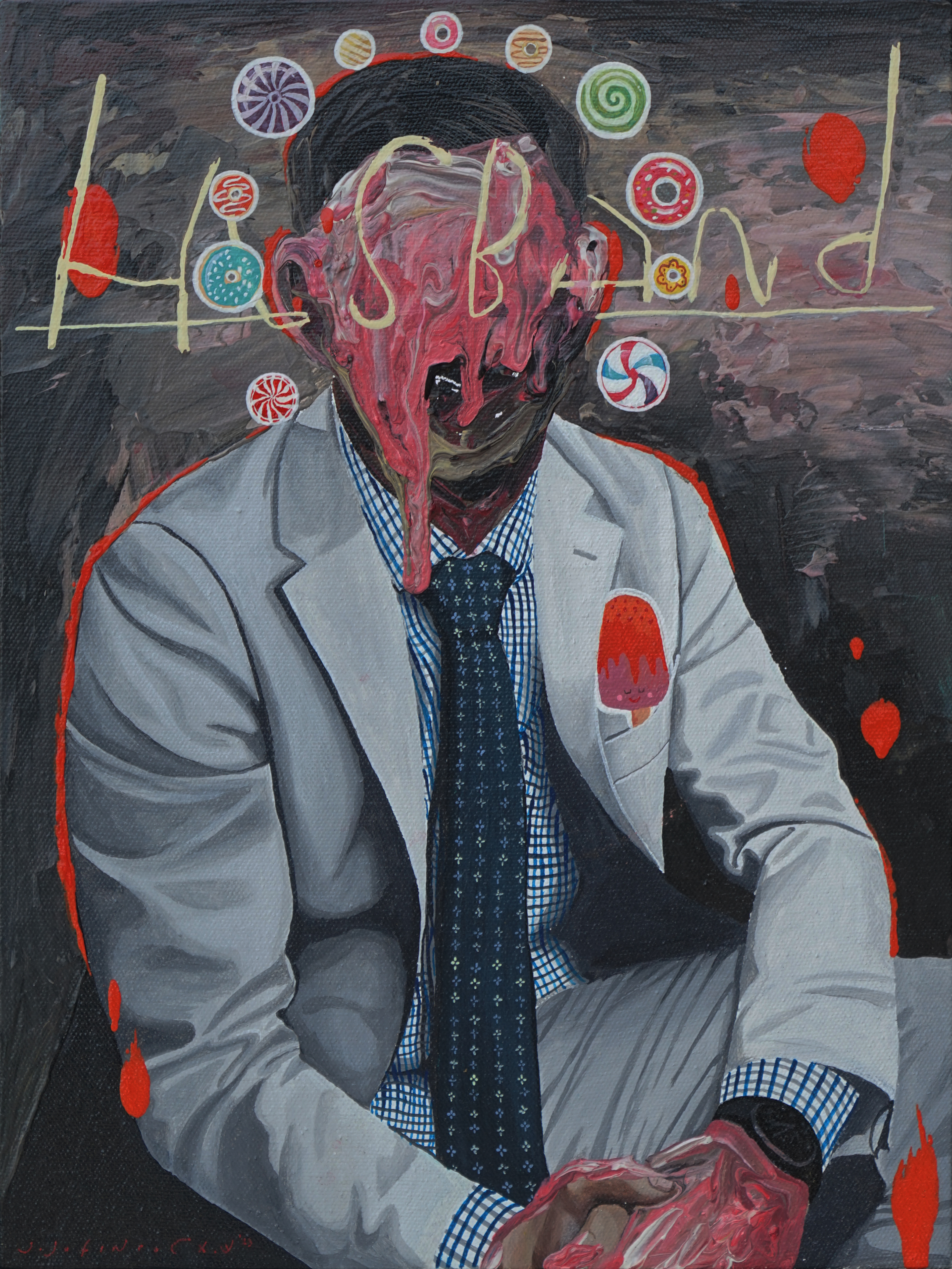 The next paintings highlight classes and the dream of surpassing the current class, just like anyone's dream anywhere: Darah Daging Buah Hati – Mimpi Masyarakat Tropis #1 and Darah Daging Buah Hati – Mimpin Masyarakat Tropis #2 (2024): scenes of a middle-class family photo in a warm room. Fresh fruit (banana, papaya) covers the faces of the children; while the faces of the adults seem to melt. The dream of pleasure for children can be simple. Adults, on the other hand, need extra effort to realize their dreams. If we read into the titles, it is a mirage for an average family, let’s call them the bottom tier, to become a well-established middle-class family with all the facilities and privileges. The painting shows the issue of social class and (food) sovereignty that occurs in any part of the world.