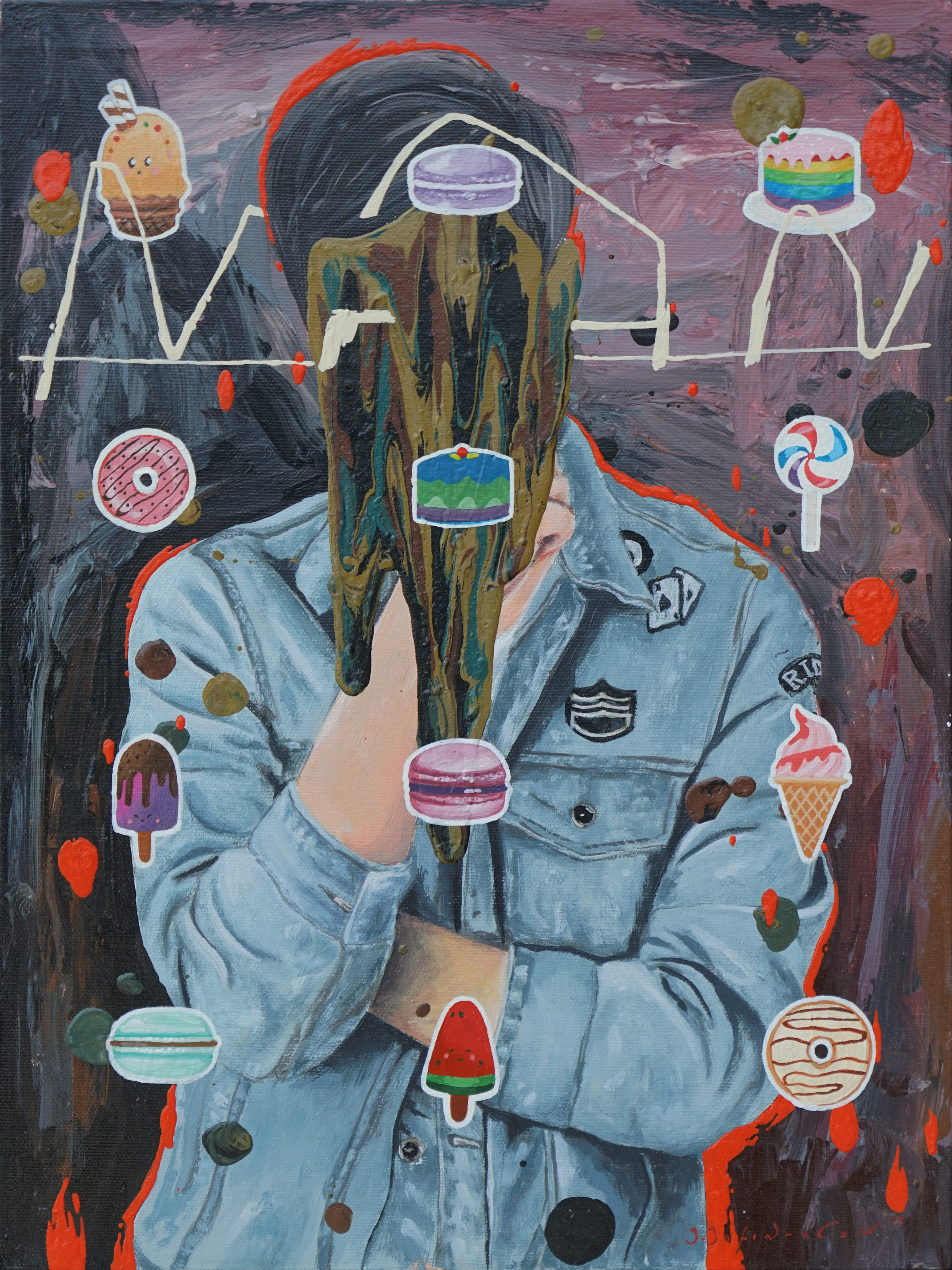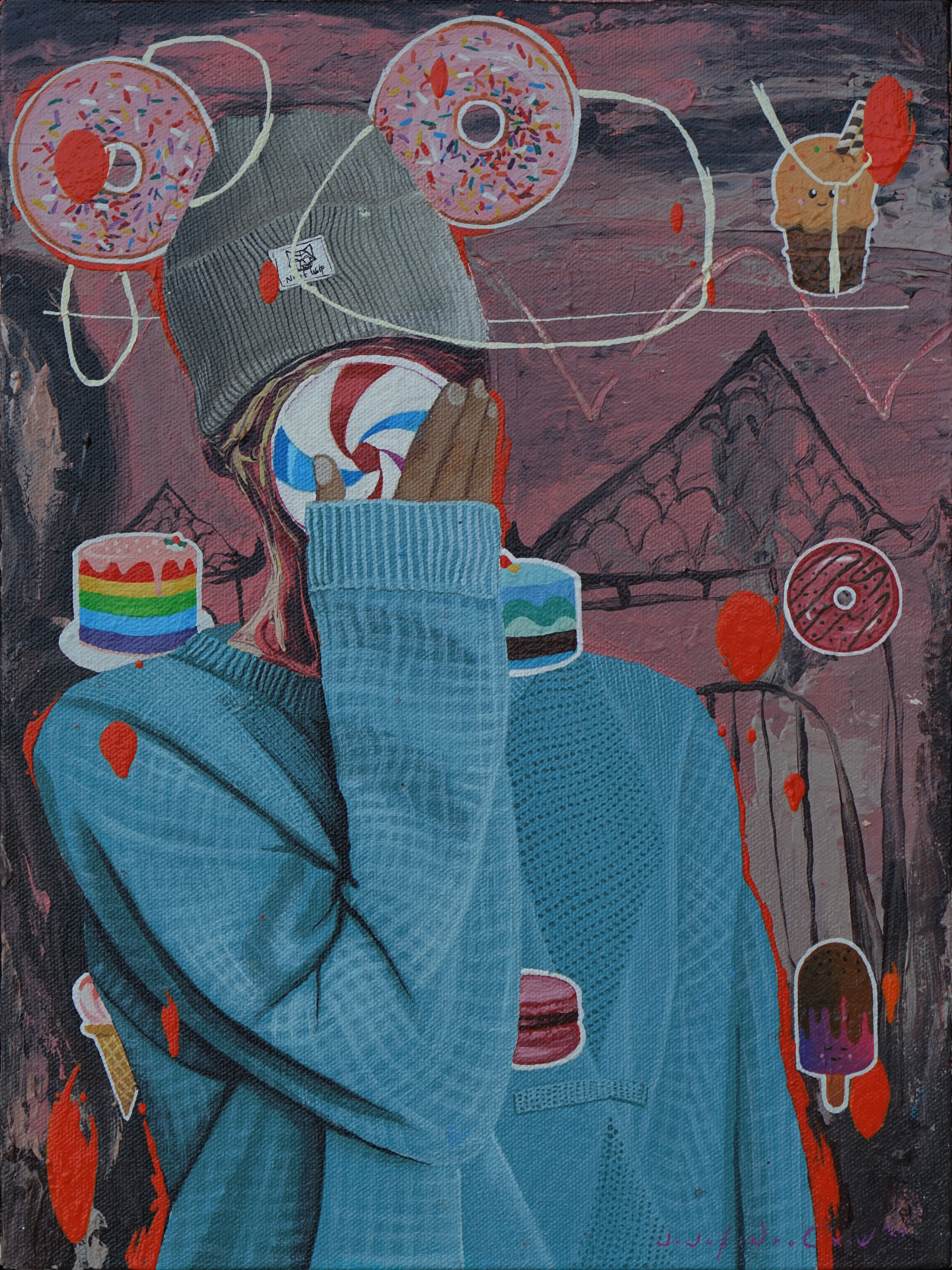 How Jafin processes the issues in his surroundings on contradictions, clashes of cultures and traditions, can be traced for instance in the painting Bara Beku (2024): a landscape full of snow, mountains, and cold-resistant fir trees. The burning fire left behind embers, and a cloud of black smoke rises from a fancy framed family photo. The rising flames and smoke show a trace of colorful rainbow at the edges. There are two figures on the right (blue flame-headed) and left (red flame-headed), both wearing full-suits, playing wind musical instruments. The figure in the middle is wearing a winter coat, has a head of a doll, reading a thick book. The entire scene is set in snow, and even snowballs are falling. Paintings with the same title, Bara Beku (second and third paintings) focuses on the flames and thick smoke, coming from the burning sofa. Around the sofa, objects such as luggage, bags, wrappers, parcels, watermelons, and toys are scattered. The snow drops are no longer white, it’s red. In the third painting, the sofa and the objects in it, all are burning in big fire; the falling snow is in the color of white and red.