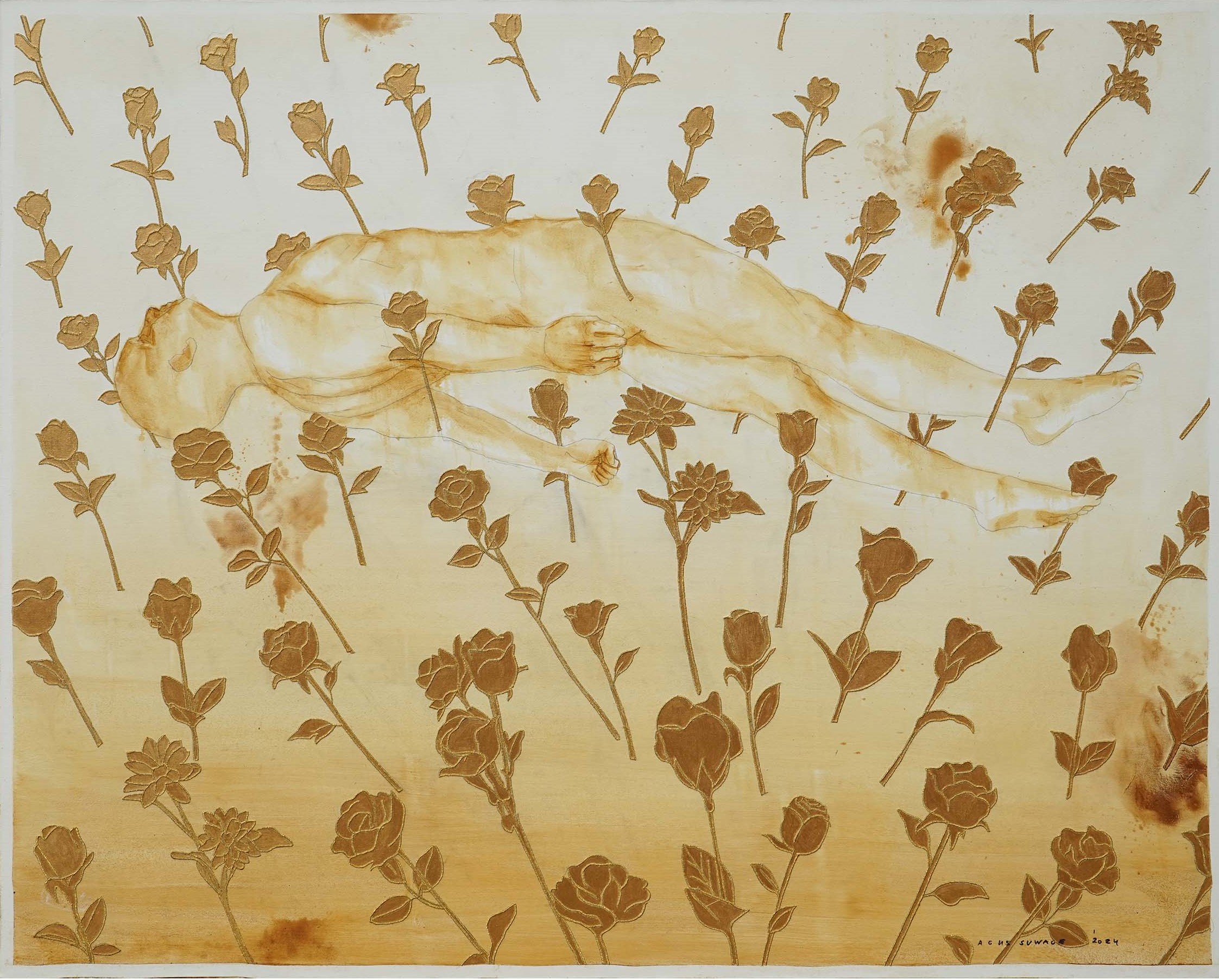Moksa II is a short bald man, floating peacefully between the 67 rose stalks. The Indonesian Dictionary description on the meaning of “moksa” as “the level of life free from worldly ties and free from reincarnation”. By that, I want to understand, instead of interpreting, the roses as a symbol of “worldly attachment” and the peaceful floating scene as a symbol of “living detached” in Moksa II. This interpretation might be different to the interpretation of other audiences, and it might not be in line with the painter’s intentions. But, we can all believe that the different interpretations that are creating a poetic effect that makes Moksa II would always piqued interest and curiosity, and never be exhausted as a source of enjoyment.