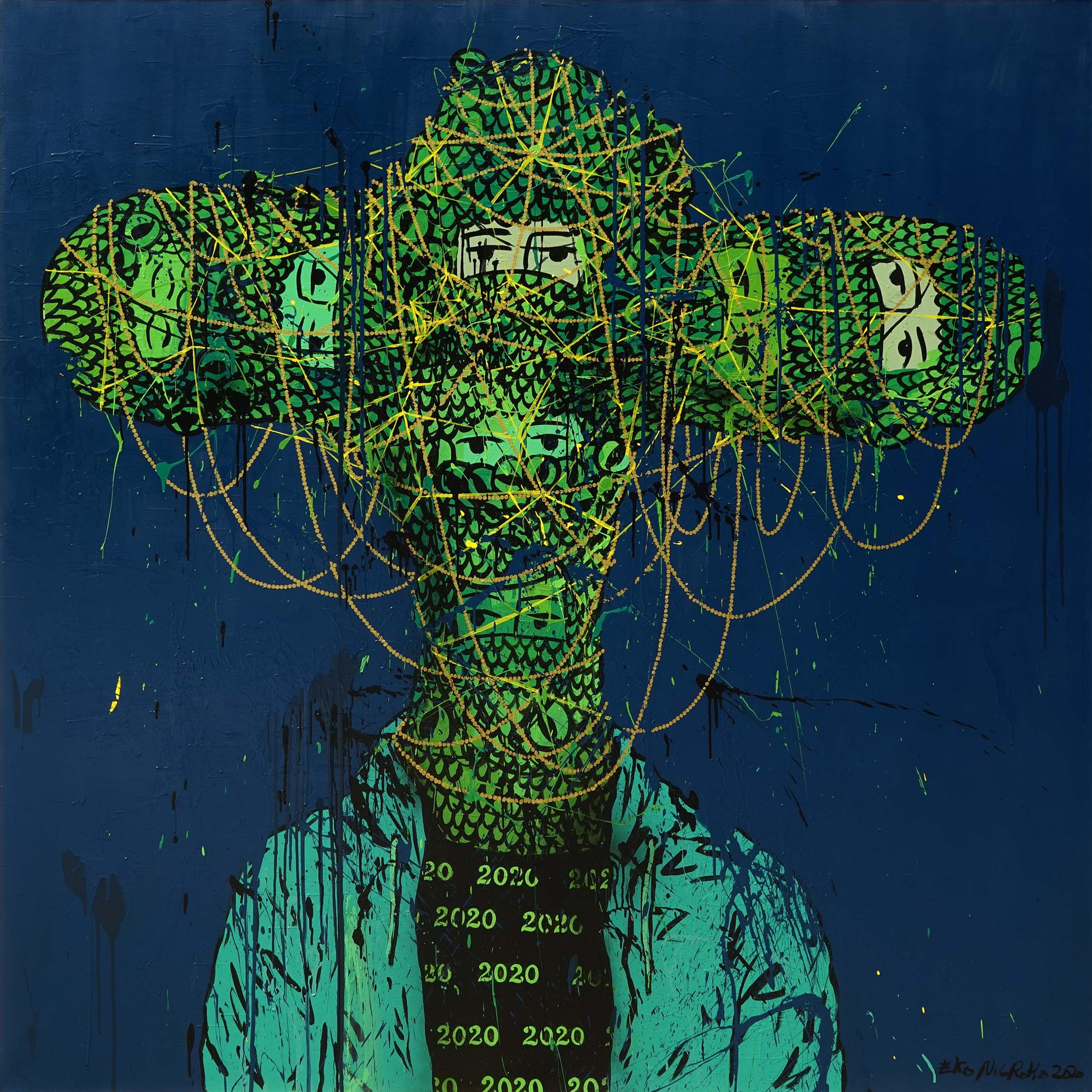 The three paintings by Eko Nugroho are, 2020 for 20M Faith (2020, acrylic on canvas, 200 x 200 centimeter), Life for Life, Hoax for Hoax, Human for Human (2020, acrylic on canvas, 200 x 200 centimeter), and Self Strength (2020, acrylic on canvas, 200 x 200 centimeter), looking similar but not the same: portraits of four- and twelve-eyed faceless humans covered in various kinds of decorations, as if gazing or peering from behind a thick bush or vegetation.