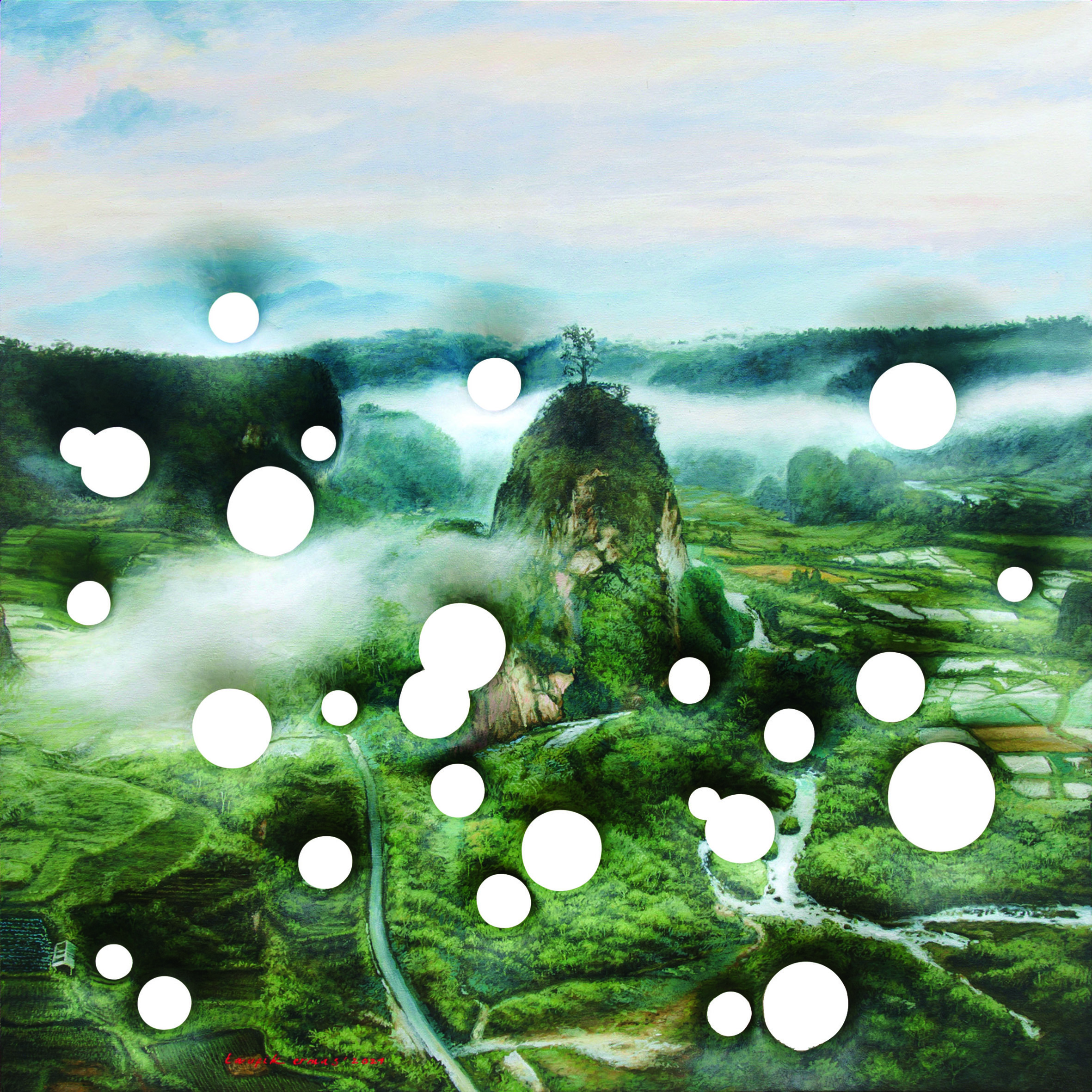 Expanding these possibilities is also meant to question. Is it true that the idea of painting a landscape as the main object can only appear, as its original form that is understood and conceptualized? What if the meaning of the landscape was dismantled? However, the landscape or natural scenery is formed from various mutually exclusive objects such as the sky, mountains, land, trees and everything contained within. If the parts that make it happen are separated, cut into parts, distorted and even abstracted, is it possible that the essence of the landscape idea can still be presented.