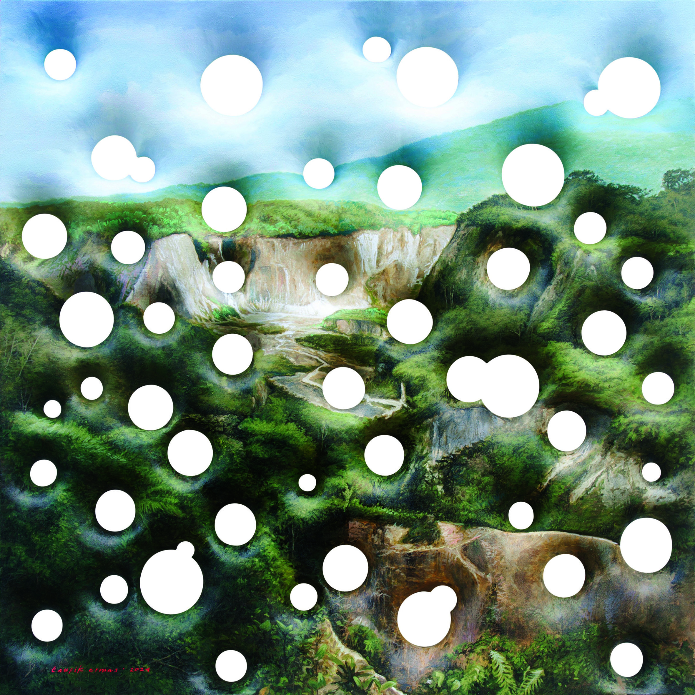If western domination and colonialism shape knowledge, Taufik Ermas' way of painting could be considered as an attempt at deconstruction. The two dimensions in Taufik's paintings are not completely two dimensions. The painting has a hole in it. Through this specific “hole”, in implies depth, the presence of space. What Taufik often paints are about absence, but what is interesting here is how absence is not completely absent. The holes in the canvas also leave boundaries where these boundaries inevitably frame our imagination.
