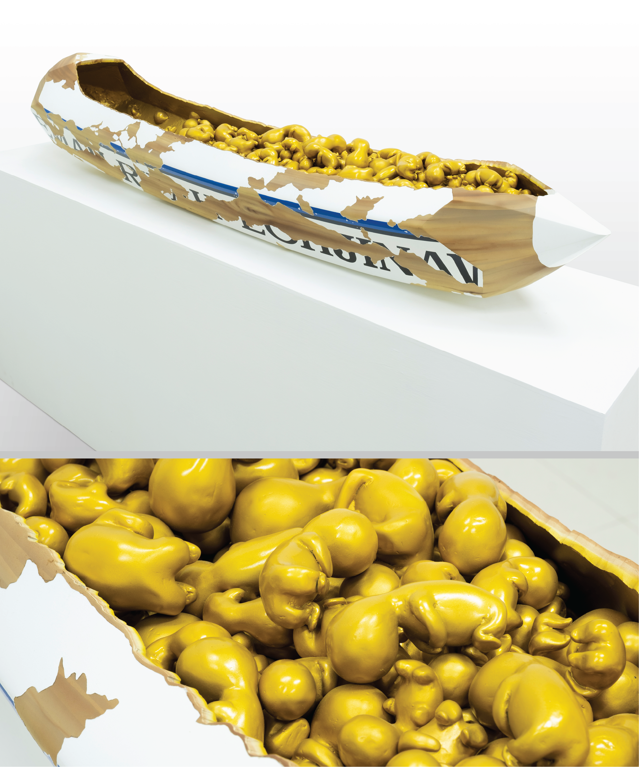 simple doll rowing a boat filled with gold bars—a striking irony