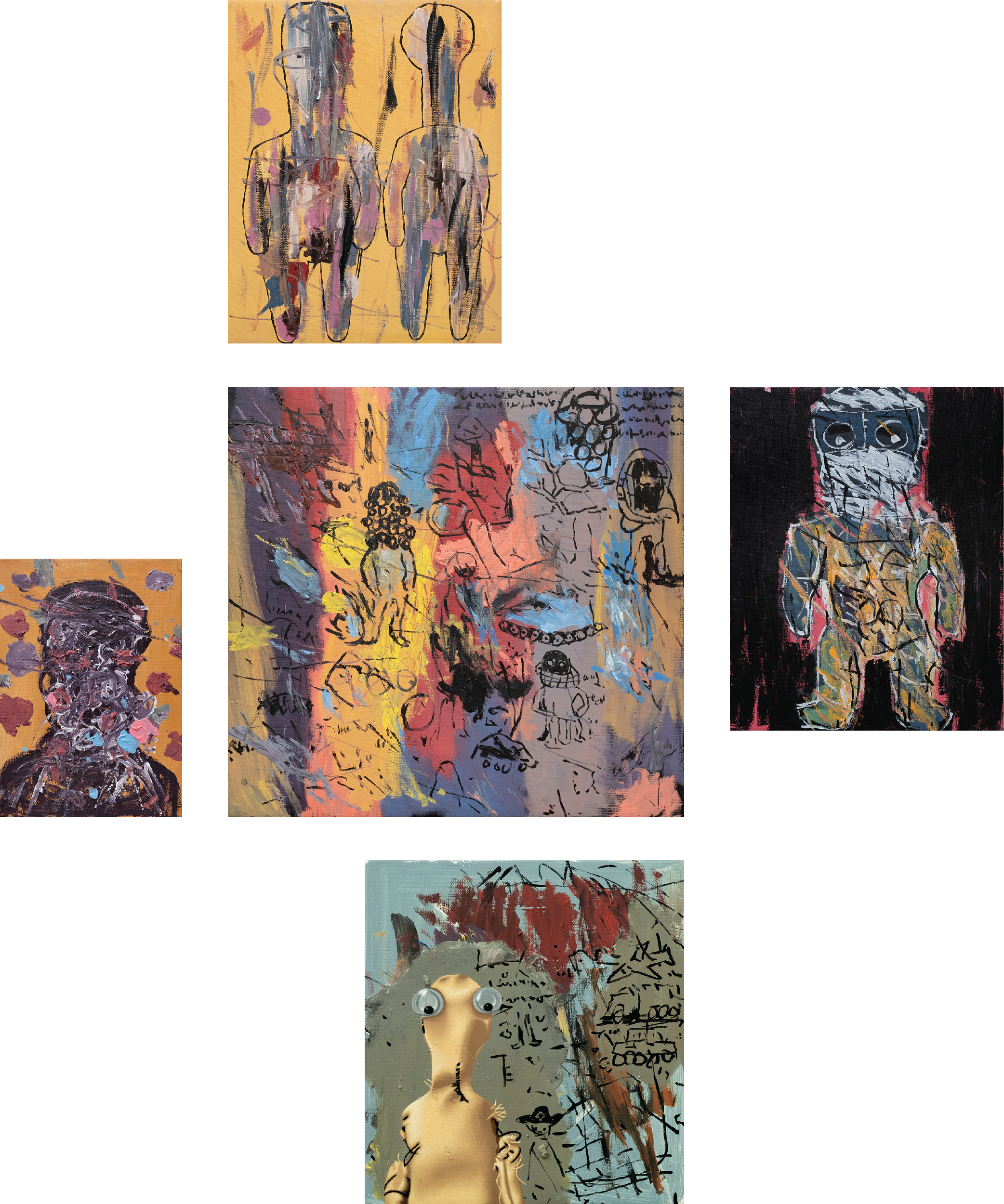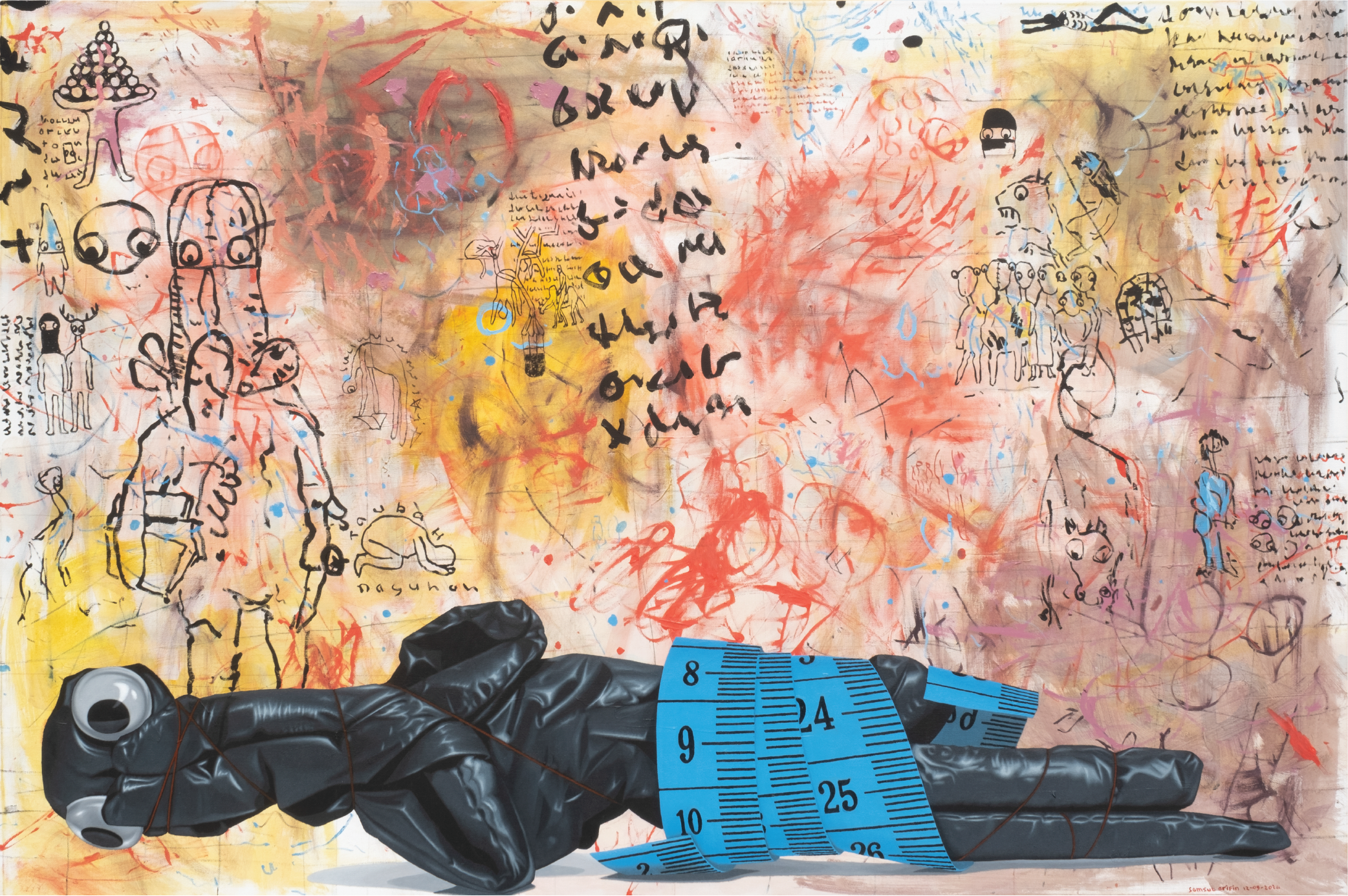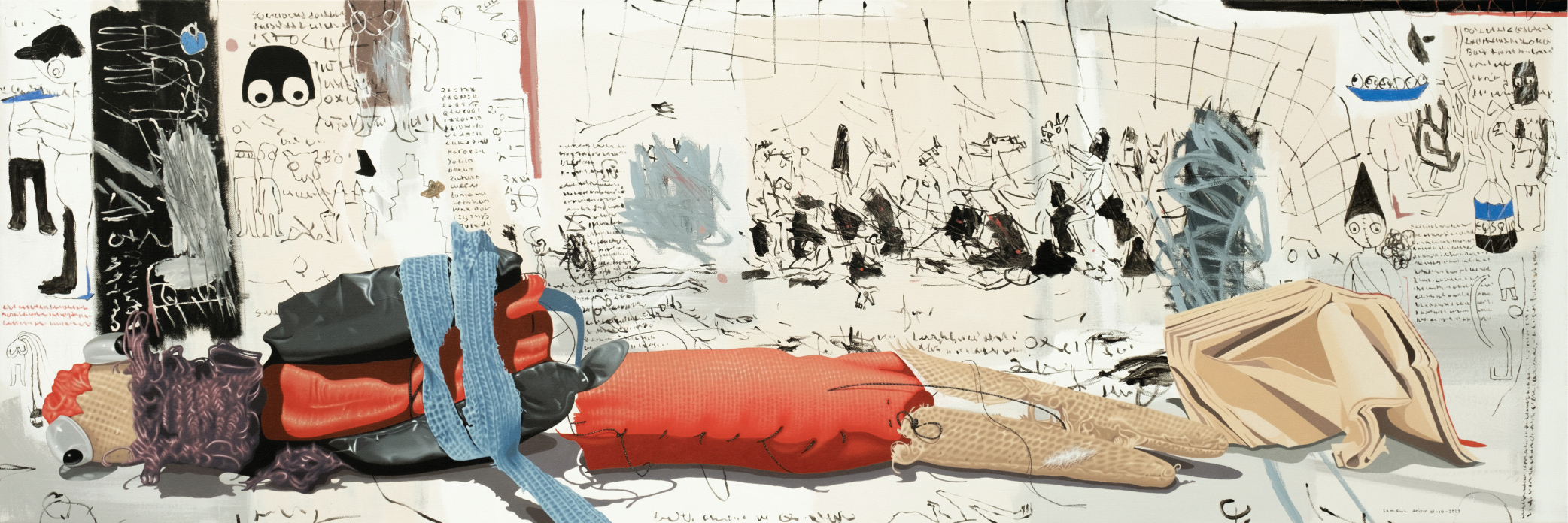 of these paintings, dolls lie horizontally across the canvas,